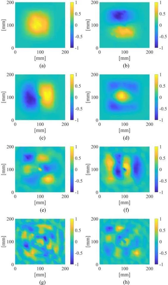(a) 2119 Hz (Movie 1), (b) 3663 Hz (Movie 2), (c) 3800 Hz (Movie 3), (d) 6219 Hz (Movie 4), (e) 7678 Hz (Movie 5), (f) 9503 Hz (Movie 6), (g) 108,47 Hz (Movie 7), and (h) 12,872 Hz (Movie 8)。这些是用LIP激波激励缺陷中心得到的振动模态振型,以及用LDV测量混凝土试件各点的响应。每个模式的动画在Movies1-8的补充信息中显示。振型振型的振幅以与最大值归一化的比率表示。