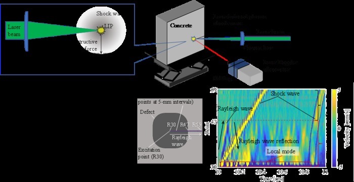 另一种检测方法是在混凝土结构表面附近产生冲击波。冲击波在结构上引起振动,可以通过分析来检测缺陷。然而,在这种试验中,必须产生不会破坏结构的冲击波。在这方面,激光诱导等离子体(LIP)激波激发显示出很大的潜力。该技术已被用于检测各种结构的缺陷,从管道到水果表面。在这种方法中,激光产生的等离子体与空气碰撞产生冲击波。