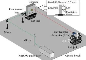 混凝土缺陷检测系统采用非接触、非破坏性激励的LIP冲击波。在实验台上,Nd:YAG脉冲激光器的激光束通过平凸透镜聚焦到试件表面附近,产生LIP冲击波。在这种情况下,使用单轴LDV。为了测量混凝土中的多个测量点,依次手动移动LDV。